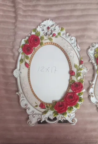 Set de dos marcos de fotos decorativos con un diseño elegante y romántico. - Elaborados con detalles de rosas rojas y hojas verdes. - El material es tipo cerámica. - Uno ovalado y otro rectangular con bordes ondulados.