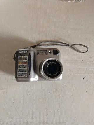 Cámara de fotos réflex digital de la marca Nikon, del año 2007. Cámara compacta muy resolutiva, con flash incorporado. Muy ligera y manejable. Características: - 10.2 megapíxeles. - Tipo de lente (lente de aumento). - Pantalla LCD. - Batería de litio. - Modos de disparo: horizontal, deportes, retrato, retrato nocturno, niños, paisaje, primer plano. Es una cámara de gran calidad y está en perfecto estado, salvo el obturador que lo tiene estropeado, con lo que habría que arreglar esa parte. Incluye correa para colgar. Conserva su embalaje original y manual de instrucciones con DVD para aprender a usarla.