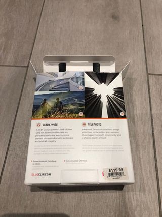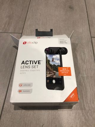 OLLOCLIP ACTIVE LENS SET La lente super gran angular para iPhone 7 y 7 plus captura los paisajes y los sujetos hasta 120 ° de visión con la mínima distorsión. Funciona con todas las aplicaciones de la cámara y también es ideal para videos, time-lapse, panoramas y fotos panorámicas de 360 grados. Nueva a estrenar. Precio de Compra 120€