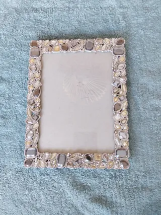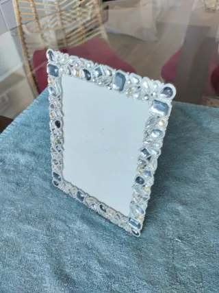 Elegante marco para fotos con un diseño adornado. Perfecto para destacar tus recuerdos. - Medidas interiores: 14x18 cm. - Marco decorado con gemas y detalles plateados.