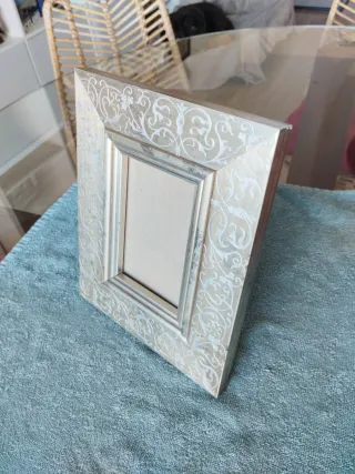 Marco de fotos plateado con detalles decorativos. - Tamaño para foto de 6x9 cm. - Color del marco: plateado. - Color del fondo: azul.
