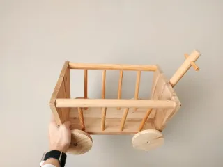 Carrito de madera artesanal, ideal para sesiones de fotos. - Material: Madera natural. - Diseño rústico y encantador. - Ruedas funcionales.