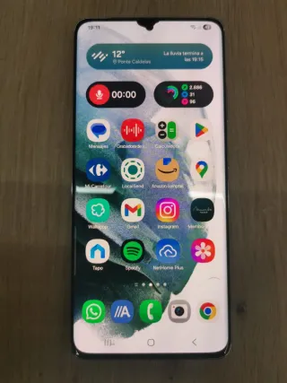 Leed bien! Samsung S21 Ultra 5G 12GB de RAM y 256GB de memoria interna. El móvil va como un tiro pero en las últimas fotos puedes ver las taras que tiene. 1: En la zona de la cámara frontal tiene una mancha negra. No influye al funcionamiento ni de la pantalla ni de la cámara. 2. En la parte inferior derecha tiene un astillazo, el cual con la pantalla encendida casi ni lo ves y tampoco afecta al funcionamiento de la pantalla. Por la parte trasera está en muy buen estado. Sin cargador ni caja. La batería me dura todo el dia sin problemas, a veces incluso llega al dia siguiente. Nunca lo dejo bajar del 20%.