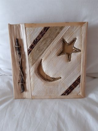 Precioso álbum natural. Ideal para guardar recuerdos especiales. Tapa de material natural con incrustaciones. Diseño con motivos de luna y estrella. Cierre con cordón de yute y elemento decorativo de madera.