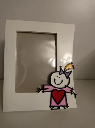 Marco de fotos blanco con un diseño de niña con corazón. - Tamaño para foto de 10x15 cm. - Adorno de niña con lazo y corazón.