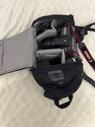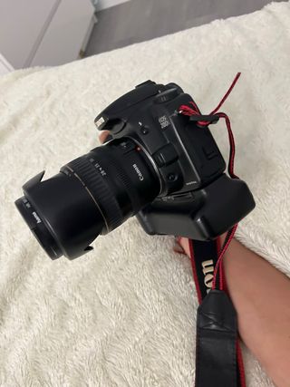 Cámara de fotos Canon EOS 20D con enpuñadura y todo tipo de accesorios: Mochila Lowepro, cinta para colgar, cargador de baterías