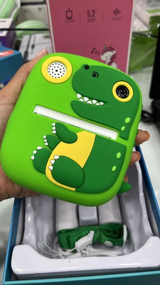 Cámara digital con diseño divertido de dinosaurio, ideal para los más pequeños. Permite imprimir fotos al instante.( disponible rosa,verde ,azul - Carcasa de silicona verde con detalles. - Ranura para impresión. - Altavoz y lente. - Incluye accesorios en la caja.
