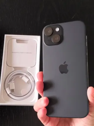 Teléfono móvil iPhone 15 en color negro con 128GB de almacenamiento. No usado, únicamente encendido para probar cámara. Como nuevo. Siempre ha estado guardado en la caja. - No envío, solamente entrega en mano. -No rebajo ni cambio. -Regalo funda nueva color topo. Características: - Diseño elegante y moderno. - Cámara dual para fotos de alta calidad. - Pantalla nítida y vibrante. - Incluye cable de carga USB-C.