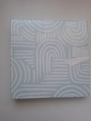 Álbum de fotos con un diseño moderno y abstracto en tonos pastel. - Cubierta con estampado de líneas y arcos en blanco sobre fondo azul claro. - Encapsulado en plástico protector. - Incluye pegatinas