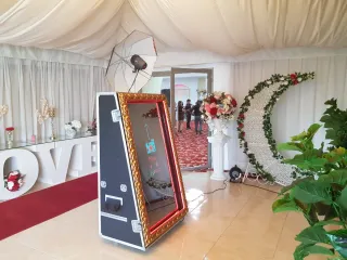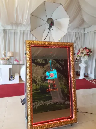 Este es un espejo mágico interactivo, ideal para eventos. Hace fotos de alta calidad. Con un programa sencillo puedes ponerle a las fotos plantillas, dibujos...guardarlas en un pen, mandarlas a redes sociales sociales, imprimirlas en el momento, hacer vídeos... - Marco dorado con detalles ornamentales. - Iluminación LED integrada en el marco. Incluye tambien: -Cámara fotográfica profesional Canon -Ordenador HP -Impresora DNP alta definición Regalo: -Atrezzo y carteles -Fondos fotográficos Puede ser para uso personal o trabajo. Con unos pocos eventos se amortiza el gasto. Fácil de mantener.