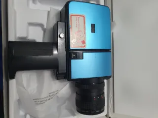 Cámara de vídeo vintage con un diseño llamativo. - Cuerpo principal en color azul metálico. - Empuñadura ergonómica en color negro.