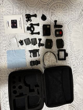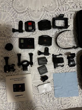 Kit completo de accesorios para cámara de acción Campark. Incluye todo lo necesario para montar y usar tu cámara en diferentes situaciones. - Correa para cabeza y pecho. - Soporte para manillar. - Batería adicional. - Múltiples adaptadores y soportes.