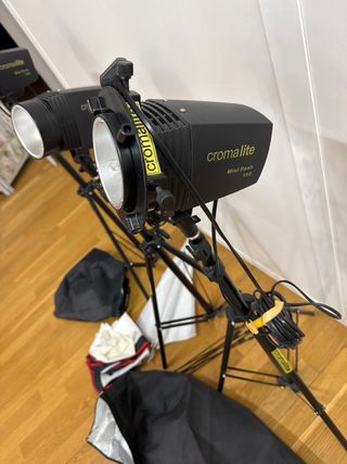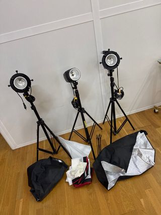 Se vende equipo de iluminación de estudio. - Tres focos de estudio. - Incluye soportes y accesorios. - Ideal para fotografía y vídeo.
