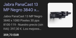 Jabra PanaCast. Megapixeles: 13 MP. Tipo HD: 4K Ultra HD, Máxima resolución de video: 3840 x 1080 Pixeles, Velocidad máxima de cuadro: 30 pps. Bluetooth. Color del producto: Negro Reuniones inclusivas con vídeo 4K panorámico, tres cámaras de 13 megapíxeles y sistema patentado de combinación de imágenes de vídeo en tiempo real con cobertura de sala de 180°. > Tecnología de vídeo inteligente con zoom inteligente y Vivid HDR que optimiza la calidad del vídeo en diferentes condiciones de iluminación > Facilita la colaboración con la conexión plug and play: solo tiene que conectar el dispositivo al ordenador y empezar a utilizarlo