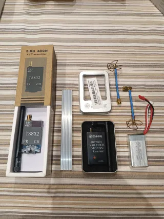 Kit FPV 5.8GHz completo NUEVO sin usar. Vendo kit completo de transmisión de vídeo FPV 5.8GHz, ideal para drones, aeromodelismo, RC o proyectos electrónicos. Incluye: -Transmisor TS832 5.8GHz 48 canales. -Receptor Eachine ROTG01 OTG para móvil Android, tablet o PC. -Antenas omnidireccionales y cloverleaf de polarización circular. -Batería LiPo. -Disipador de aluminio y cableado. Material comprado para proyecto que no se realizó. Nunca montado ni alimentado, todo a estrenar y en perfecto estado.