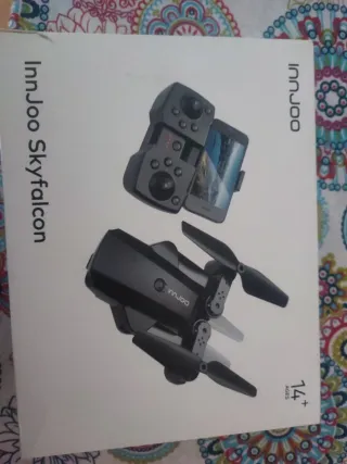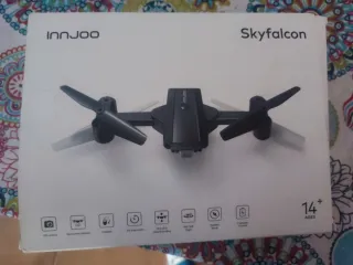 Dron InnJoo Skyfalcon en color negro, ideal para iniciarse en el mundo de los drones. - Diseño plegable para facilitar su transporte. - Incluye control remoto con soporte para móvil. - Cámara integrada para capturar imágenes y vídeos. Sin abrir ,ya que le han regalado dos iguales.