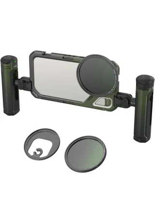 Kit de video móvil diseñado en colaboración con Brandon Li. Este conjunto está pensado para mejorar la experiencia de grabación con smartphones.PARA IPHONE 15 PRO MAX. - Incluye estructura de sujeción para móvil. - Incorpora asas laterales para mayor estabilidad. - Viene con un filtro ND magnético. - Incluye un adaptador para el filtro.