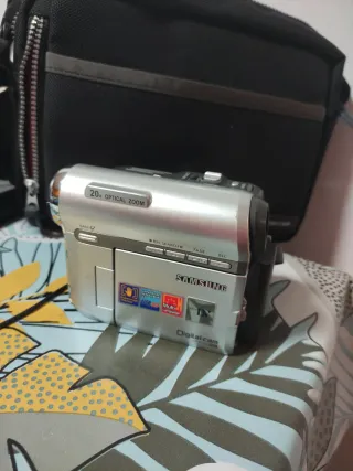 Cámara de vídeo Samsung plateada con zoom óptico de 20x. - Zoom óptico 20x. - Diseño digital cam. Contiene cargador, cables tv batería nueva y funda