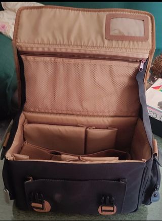 Maletin para equipo de fotografía o video. Diferentes compartimentos interiores. Dos bolsillos laterales con cremallera. Bolsillo interior de rejilla con cremallera y bolsillo exterior delantero. Con asa para llevar al hombro. Prácticamente nuevo. Marca local pero no sale en el desplegable.