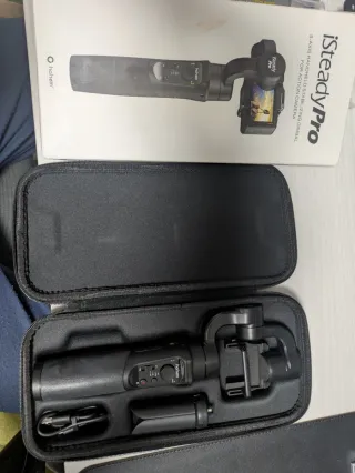 Estabilizador de cámara de acción Hohem iSteady Pro de 3 ejes. Lo he usado con una cámara YI action para estabilizar mejor los vídeos. Es válido para varios modelos Go-Pro. Se carga por Usb (cable incluido) y dura bastante (más de 2h seguro). Incluso creo que permite cargar el móvil desde la batería del gimbal, si tuvieras esa necesidad. También permite programar un timelapse (va girando muy lento). Con la App se hace la calibración. Incluye estuche de transporte.