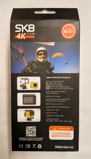 Cámara de acción SK8 Cam con resolución 4K Ultra HD y conectividad WiFi. Perfecta para capturar tus aventuras. - Resolución de vídeo 4K (3840*2160) a 30FPS. - Lente gran angular de 170°. - Sumergible hasta 50m con carcasa estanca incluida. - Pantalla trasera LCD de 2 pulgadas. - Ranura para tarjeta Micro SD de hasta 64GB (no incluida). Nueva, sin abrir. Con embalaje original. Se aceptan ofertas.