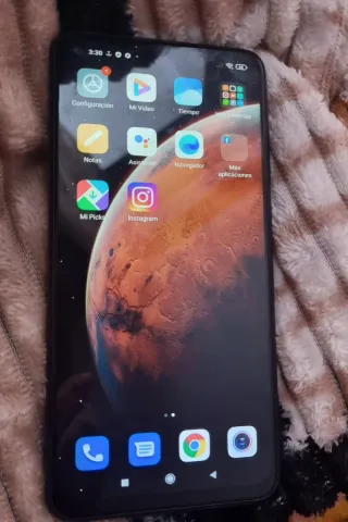 Móvil Redmi en color negro. - Pantalla con fondo de pantalla de Marte. - Iconos de aplicaciones como Configuración, Mi Video, Tiempo, Notas, Asistente, Navegador, Mi Picks e Instagram. - Barra de estado con hora y símbolos de conexión. - Botones de navegación inferiores: Teléfono, Mensajes, Chrome y Cámara.