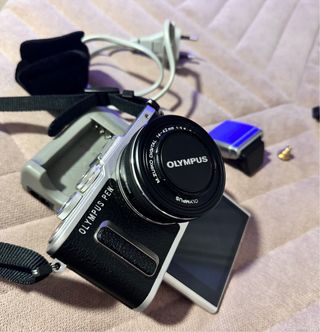 Cámara digital Olympus PEN plateada y negra. - Lente M.ZUIKO DIGITAL 14-42mm 1:3.5-5.6. Cámara digital Olympus Pen E-PL8. Pantalla abatible. Vídeo y fotografía. Incluye todos los accesorios. Diseño moderno y ligero. Precio negociable.