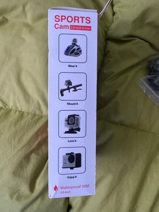 Cámara deportiva acuática tipo GoPro. Está en su caja original, totalmente nueva. Ideal para todo tipo de deportes. - Graba vídeo Full HD 1080p. - Pantalla de 2.0 pulgadas. - Resistente al agua hasta 30 metros. - Incluye varios accesorios.