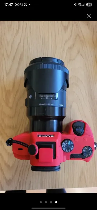 No bajo 1 euro mas esta muy barata y la vendo asi por falta de dinero Cámara fotográfica Sony Alpha a7 III con lente Sigma 35mm f/1.4 DG DN. - Cuerpo de cámara en color rojo. - Lente Sigma 35mm 1:1.4 DG DN. - Montura E de Sony.