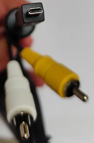 Cable de conexión con un extremo Mini USB y otro con conectores RCA (blanco y amarillo). - Conector Mini USB. - Conectores RCA de audio y video. Es un cable de audio y video compuesto (AV) diseñado para conectar cámaras digitales específicas a un televisor. Conector de cámara: Utiliza un conector compatible con varios modelos de cámaras. Conectores de TV: Cuenta con conectores RCA estándar (amarillo para video, blanco para audio mono). Función: Permite visualizar fotos y videos directamente desde la cámara en una pantalla de televisión.