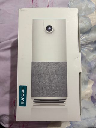 Cámara de videoconferencia Nurooum con un diseño moderno y elegante. - Parte superior blanca con lente de cámara. - Base con acabado de tela gris.