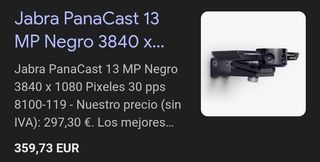 Jabra PanaCast. Megapixeles: 13 MP. Tipo HD: 4K Ultra HD, Máxima resolución de video: 3840 x 1080 Pixeles, Velocidad máxima de cuadro: 30 pps. Bluetooth. Color del producto: Negro Reuniones inclusivas con vídeo 4K panorámico, tres cámaras de 13 megapíxeles y sistema patentado de combinación de imágenes de vídeo en tiempo real con cobertura de sala de 180°. > Tecnología de vídeo inteligente con zoom inteligente y Vivid HDR que optimiza la calidad del vídeo en diferentes condiciones de iluminación > Facilita la colaboración con la conexión plug and play: solo tiene que conectar el dispositivo al ordenador y empezar a utilizarlo sin