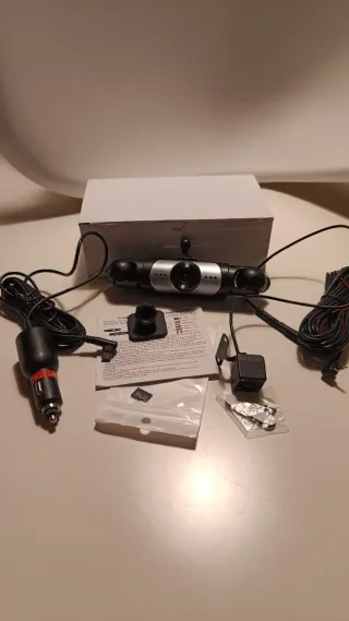 Sistema de cámara de vigilancia con cuatro cámaras para coche con resolución 1080P y visión nocturna. Una cámara frontal, dos laterales izquierda, derecha regulables y la trasera para visión aparcamiento trasero. Grabadora de vídeo 360 grados, grabación en tarjeta incorporada de 64GB. Detección de movimiento. Botonera en parte inferior para menú y selección de visión cámaras, etc. Se alimenta a través de interruptor al encendedor del coche con cable extensible extra largo, aunque también tiene autonomía de funcionamiento sin alimentación. Incluye soporte para salpicadero. Cámara trasera con cable extra largo para colocación. Nueva.