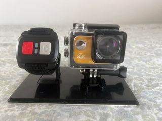Cámara de acción 4K con un mando a distancia para controlarla. - Mando con botones de encendido/apagado y grabación. - Diseño compacto y ligero.