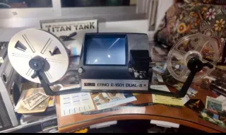 Antiguo editor de vídeo de super 8 con visor en pantalla contiene dos rollos de películas vacio bombilla de repuesto y accesorios.contiene también DOS rollos de super 8 de una película del gordo y el flaco incluido en el precio.(Casi ya la película vale la mitad del lote)