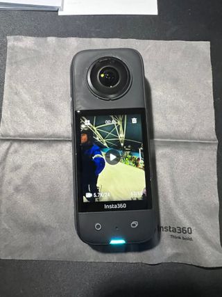 Cámara de acción Insta360 ONE X2 en color negro y gris. Incluye accesorios para su uso. - Palo selfie Insta360. - Funda protectora de silicona. - Funda de transporte. - Batería x2 - Cargador de baterías - Cable de carga USB. - Protectores de lentes (instalados) - Paño de limpieza. Usada un par de veces. Como nueva.