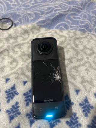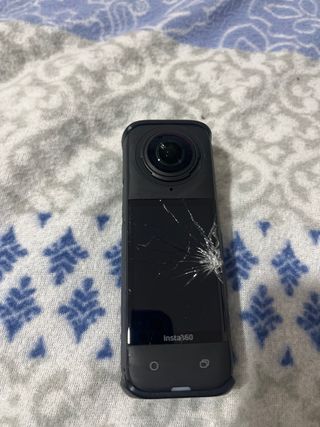 Cámara Insta360 X4 en color negro. Totalmente funcional. Tiene la pantalla rota y la lente con un rayon por el golpe. Ideal para reparar o usar como cámara secundaria / repuestos. Incluye batería original. Precio negociable. - Modelo X4. - Color negro.