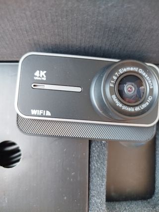 Cámara dashcam 4K casi nueva. Incluye cámara frontal y trasera. - Graba vídeo en 4K Ultra HD. - Conexión WiFi integrada. - Lente de cristal de 7 elementos. - Sensor de 8 megapíxeles.