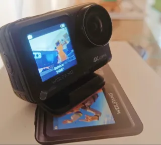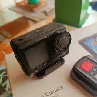 Cámara deportiva Wolfang GA420. Estado impoluto tanto de lente como de pantallas, todavía con el plástico adhesivo. Precio nueva 150 euros . - Grabación en 4K a 60 FPS. - Tres baterías. - Carcasa acuática.Es acuática sin carcasa. - Todos los accesorios, mando a distancia incluido. - Diseño compacto y resistente.