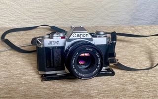 Cámara analógica Canon AV-1 con objetivo FD 50mm 1:1.8. - Cuerpo plateado y negro. - Objetivo Canon Lens FD 50mm 1:1.8. - Fabricado en Japón.