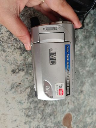 Cámara de vídeo JVC en color plata. Incluye su funda y cargador. La tapa de la zona donde está la tarjeta está un poco rota pero no afecta para nada - Funda de transporte. - Cargador de corriente.