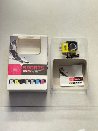 Cámara de acción Full HD, perfecta para deportes y aventuras. - Resolución de video 1080p. - Resistente al agua hasta 30 metros. - Incluye accesorios de montaje a estrenar. - La pantalla instalada está rayada, pero adjunto una nueva a estrenar.
