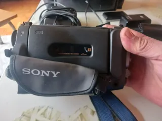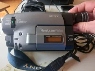 Cámara de vídeo Sony Handcam Vision en tonos grises y negro. Ideal para capturar tus recuerdos. - Zoom óptico 15x. - Pantalla LCD. - Correa de mano Sony. -3 Baterias(una de ellas para poner pilas recargables. -Adaptador/cargador a luz. -se incluye bolsa de transporte e instrucciones.
