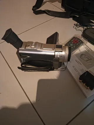 Cámara de vídeo Samsung en acabado plateado y negro. - Visor. - Correa de mano. - Mando a distancia. - Cable de conexión.maleta de transporte con diferentes compartimentos , funciona perfectamente.