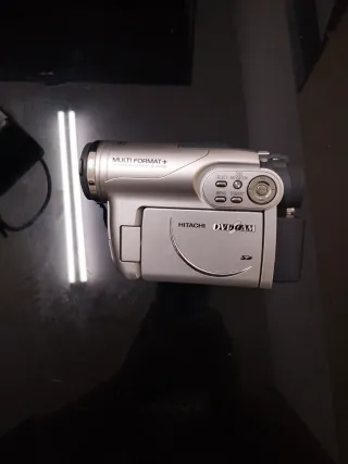 Cámara de vídeo Hitachi DVD CAM en color plateado y negro.Esta nueva se uso 2 veces - Formato Multi Format+. - Ranura para tarjeta SD.
