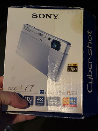 Cámara digital compacta Sony Cyber-shot DSC-T77. - 10.1 megapíxeles. - Zoom óptico 4x. - Pantalla táctil. - Grabación de vídeo Full HD 1080. - Estabilizador de imagen Optical SteadyShot. Cargador original Tarjeta de 1 gb Libro instrucciones Apenas usada Optica Carl Zeiss Caja contenedora original