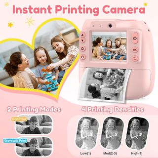 Cámara digital instantánea KIDICAMERA en color rosa. Captura fotos y vídeos en alta definición. - Incluye tarjeta de memoria de 32 GB. - Viene con cable USB y cable tipo C. - Incluye rollo de papel para impresión instantánea. - Incluye pegatinas para decorar. - Incluye 6 rotuladores de colores. NO ENVIO SOLO ENTREGA EN MANO