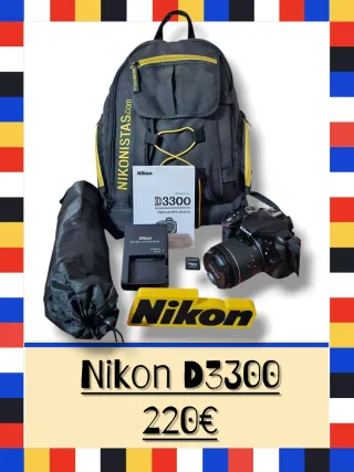 Cámara reflex nikon D3300,se encuentra en perfecto estado,1000 click,una cámara ideal para aficionados o para empezar estudiar fotografía profesional,cuenta con 24mpx,graba videos en fullhd,pantalla de 3 pulgadas,flash incorporado,posee modo guia para usuarios inexpertos,varias opciones de fotografía,ISO 100-12.800(ampliable a 25.600),11 puntos de enfoque,se entrega con objetivo 18-55,tarjeta,tripode,mochila,manual,bateria y cargador,se puede enviar dentro de España por correo certificado por 15€ más,cualquier duda por aquí o por WhatsApp al 727797700,su precio 220€,si quieres kit 2 baterias por 25€ más