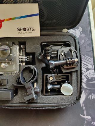 Cámara deportiva PORTDV en perfecto estado. Incluye varios accesorios para diferentes tipos de montaje. Es compacta y fácil de usar. - Cámara deportiva con lente gran angular. - Se incluyen varios soportes para casco, manillar y otros. - Dispone de una base adhesiva para una fijación segura.