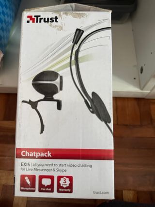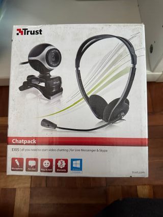 Pack de webcam y auriculares Trust Chatpack EXIS. Usado pocos veces - Webcam con micrófono integrado. - Auriculares con micrófono. - Ideal para video llamadas y chat. - Compatible con Windows 8. - 3 años de garantía.